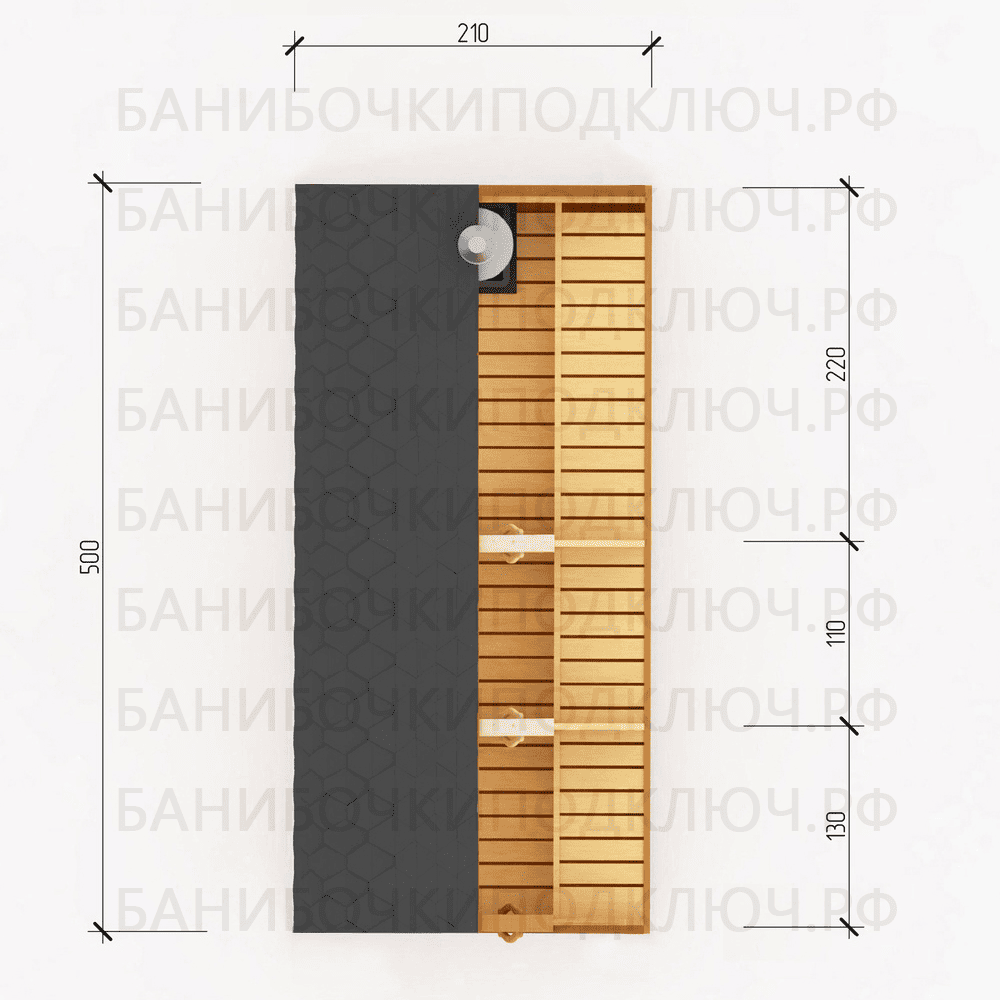комната отдыха – 350х300, парная 220х300, мойка 120х150